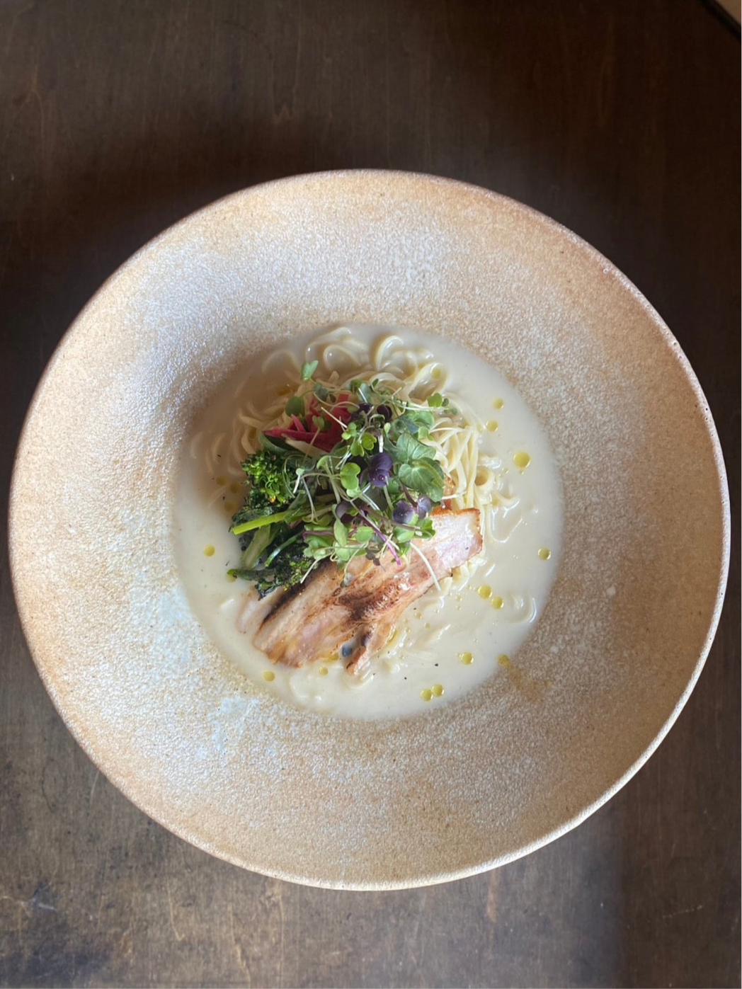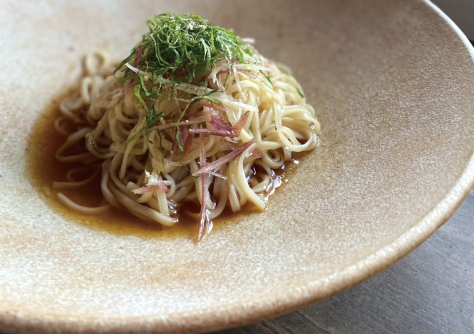 小麦胚芽麺130g・出汁100cc・揚げごぼう・九条葱・三味・山椒オイル